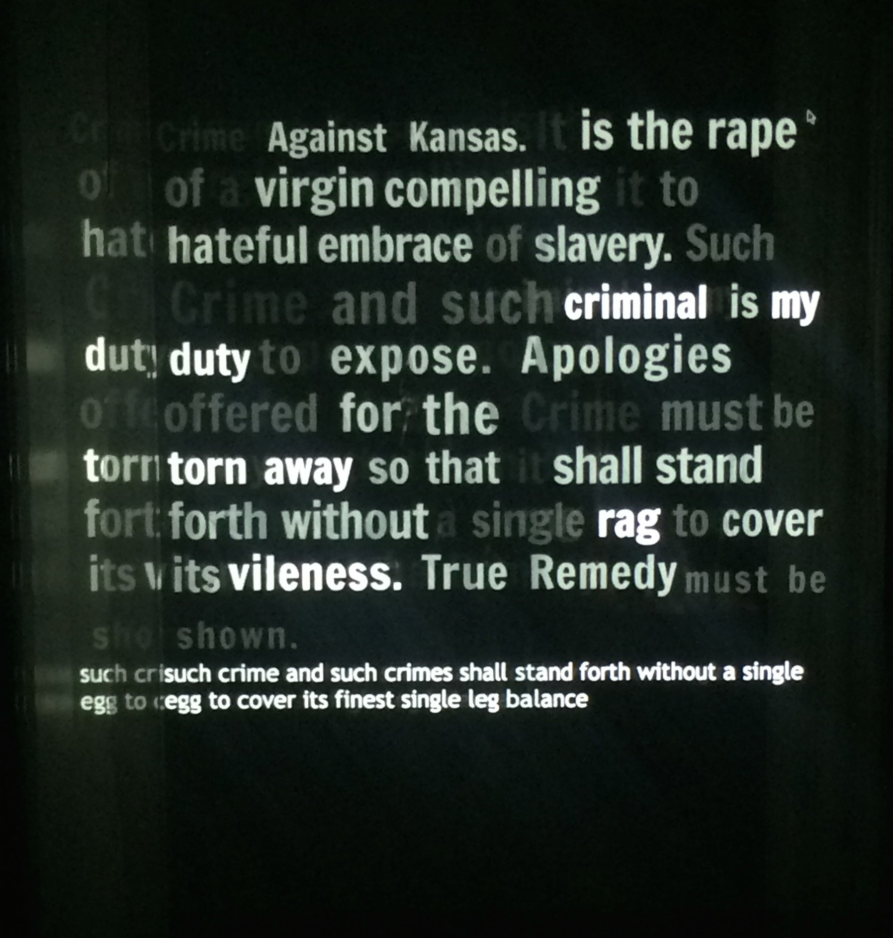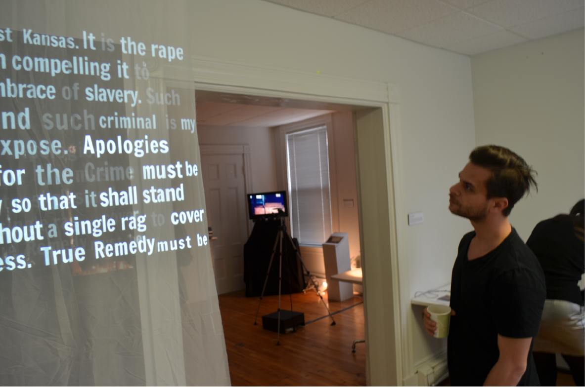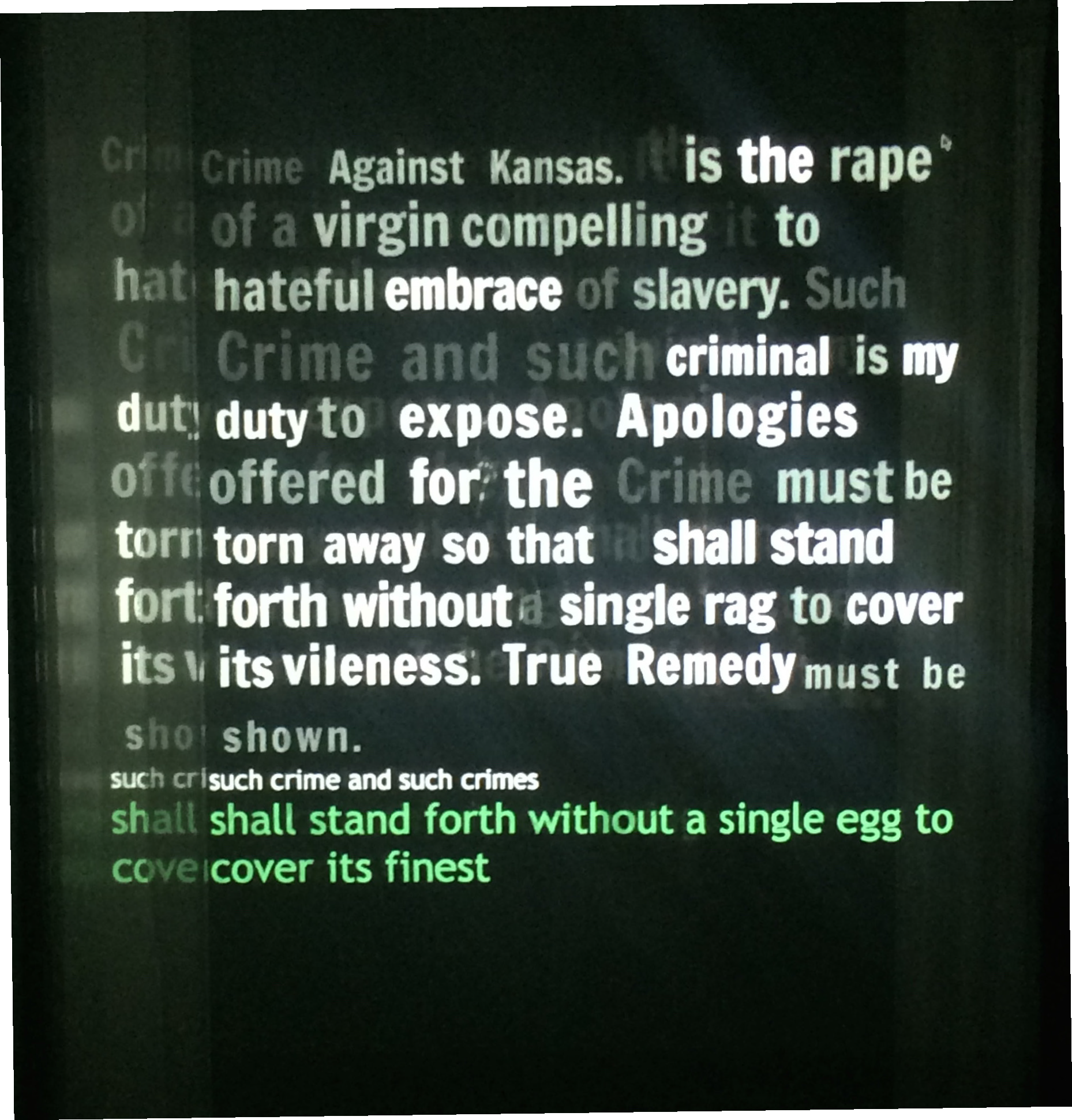 In this installation we invoke his words from "Crime Against Kensas" through projection at the site of the statue. A carefully edited portion of his actual speech is projected on a translucent material and placed between the statue and the participant. Participants are invited to read the words projected on the screen into the microphone. The projected words gradually disappear as they are spoken by the participant until finally there it becomes empty, revealing the statue behind.