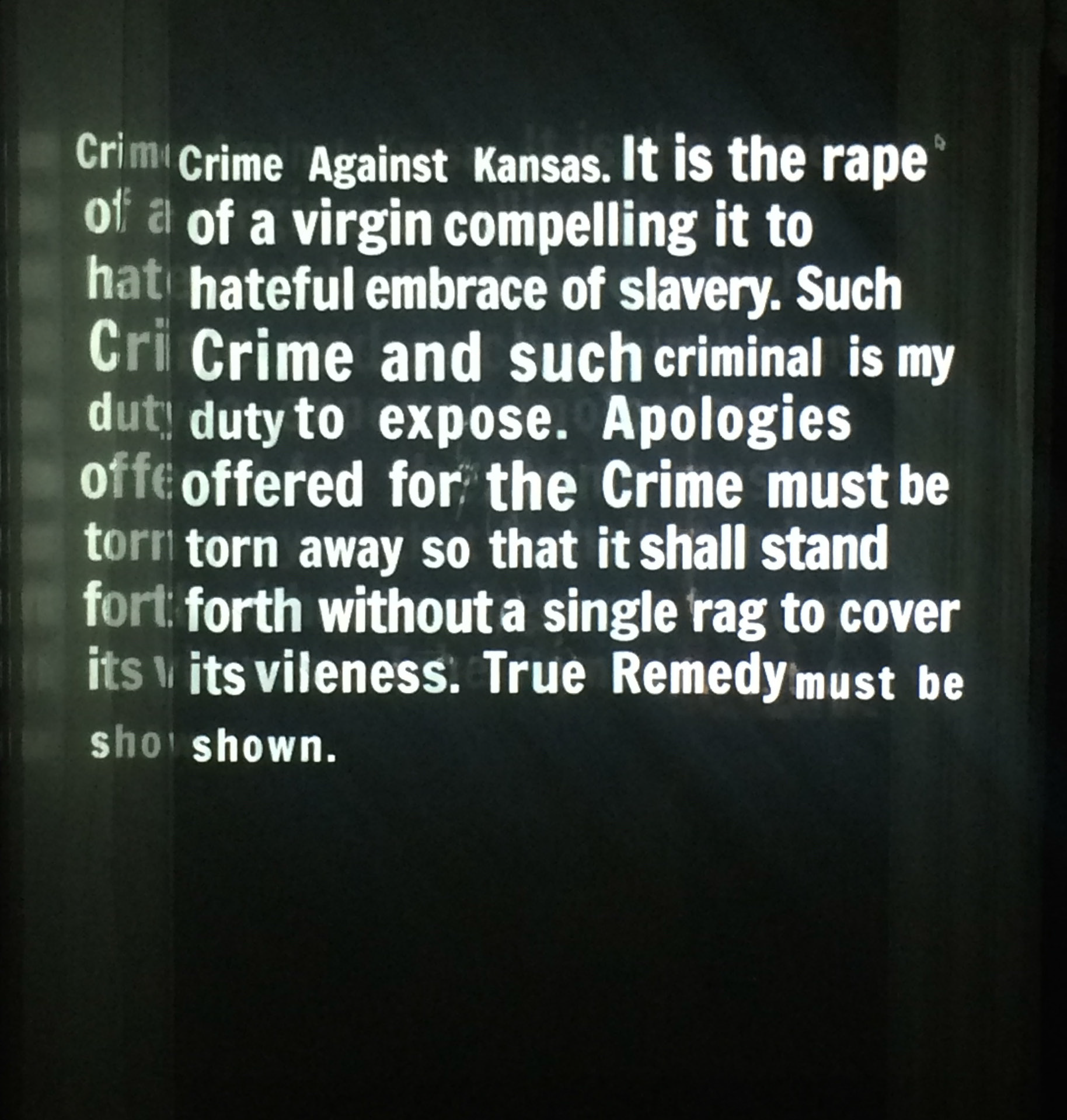 "It is the rape of a virgin Territory, compelling it to the hateful embrace of slavery; and it may be clearly traced to a depraved desire for a new Slave State, hideous offspring of such a crime, in the hope of adding to the power of slavery in the National Government." - excerpt from Crime Against Kansas