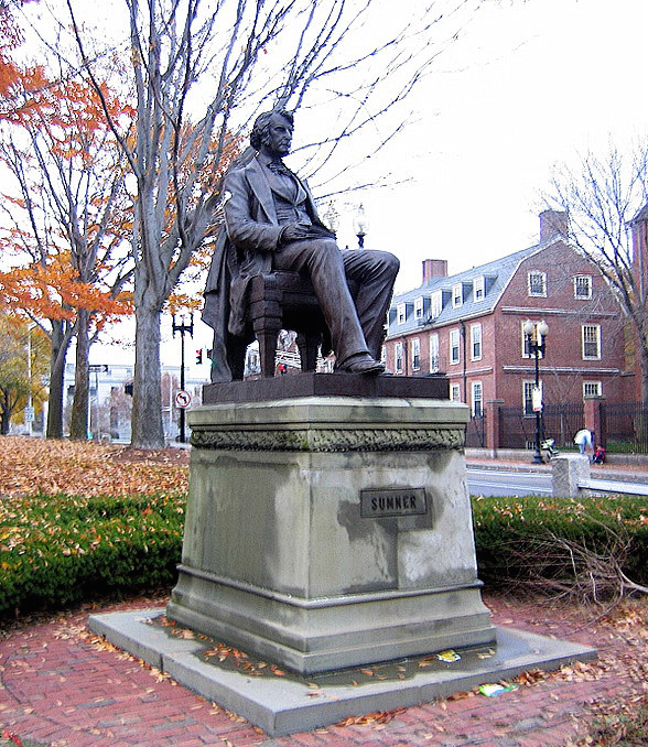 The Charles Sumner statue located at the very heart of Harvard Square was made by his friend Anne Whitney to honor his legacy in abolishing slavery. Senator Sumner, a contemporary of Lincoln, was a vocal abolitionist and did not hesitate to criticize those who did not share his views. In fact, his speeches were so provocative that after the delivery of his famous "Crime Against Kensas" speech, he was physically beaten so brutally that he remained unconscious for days.